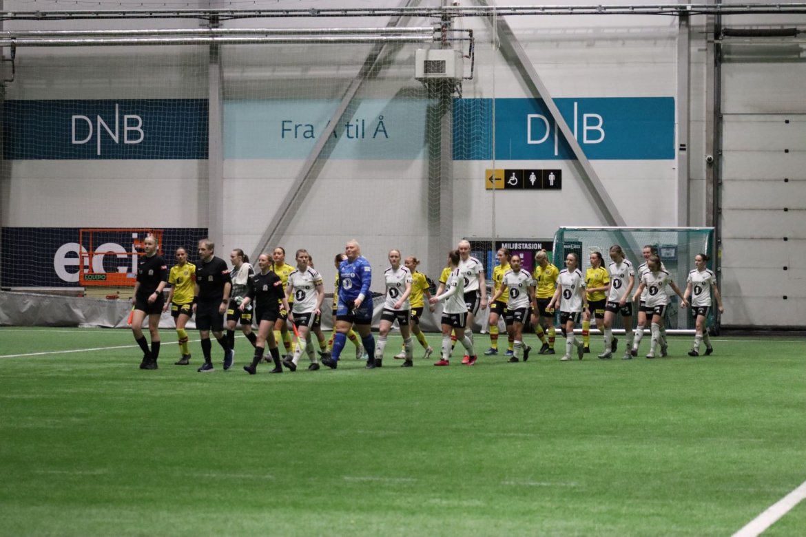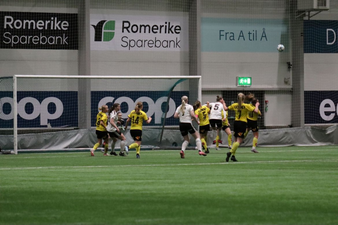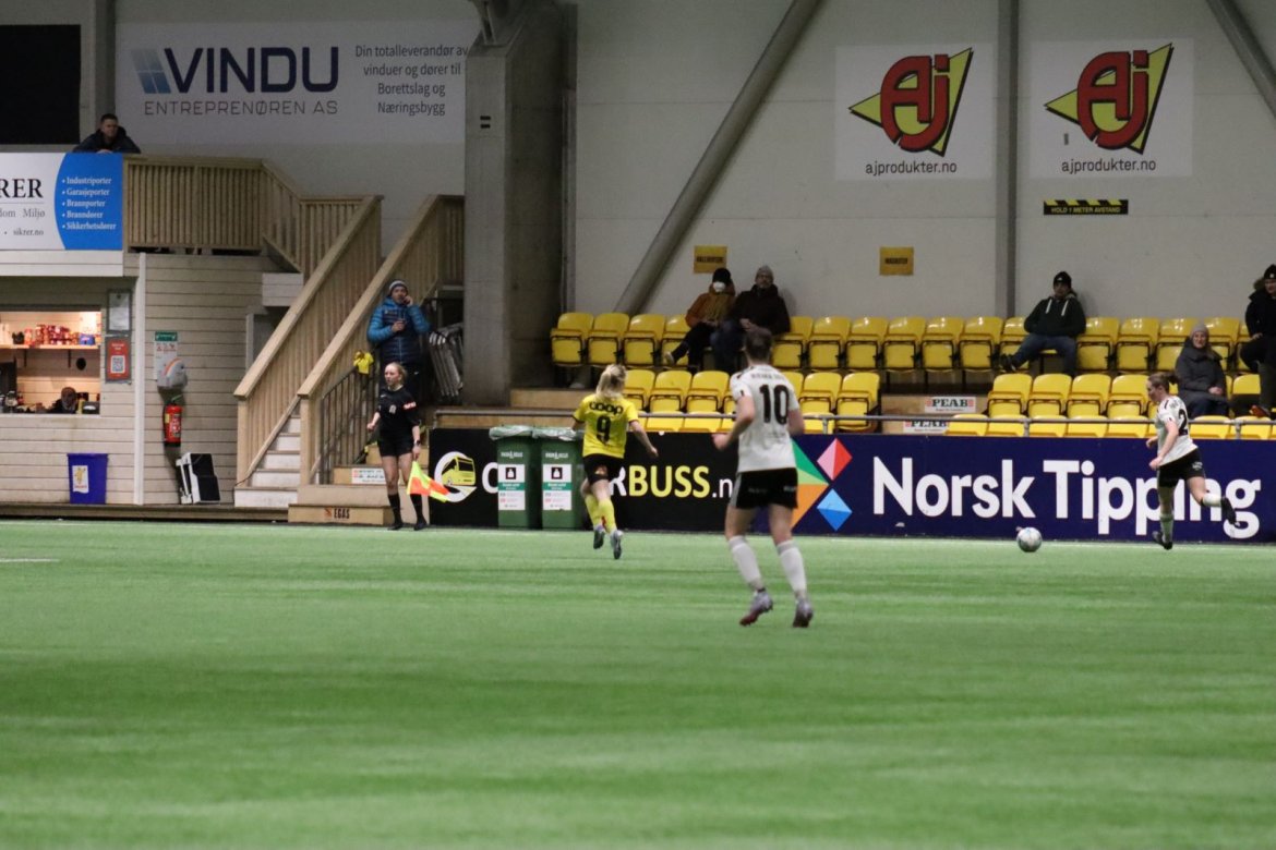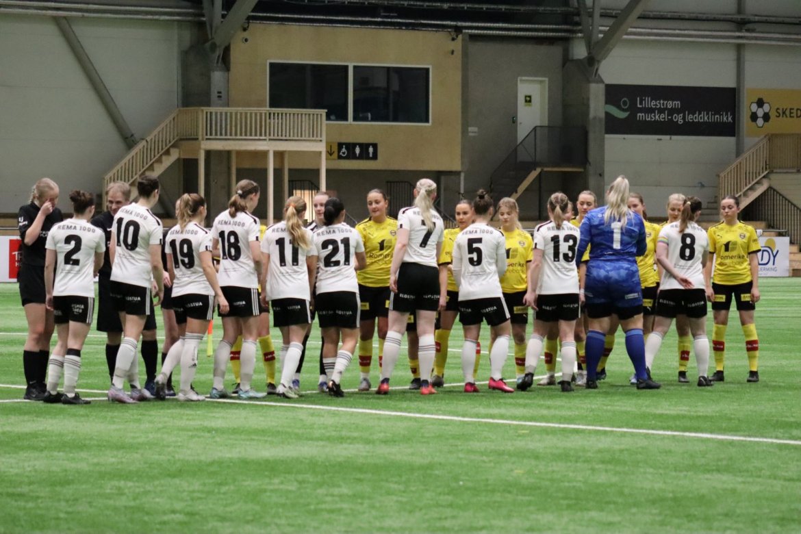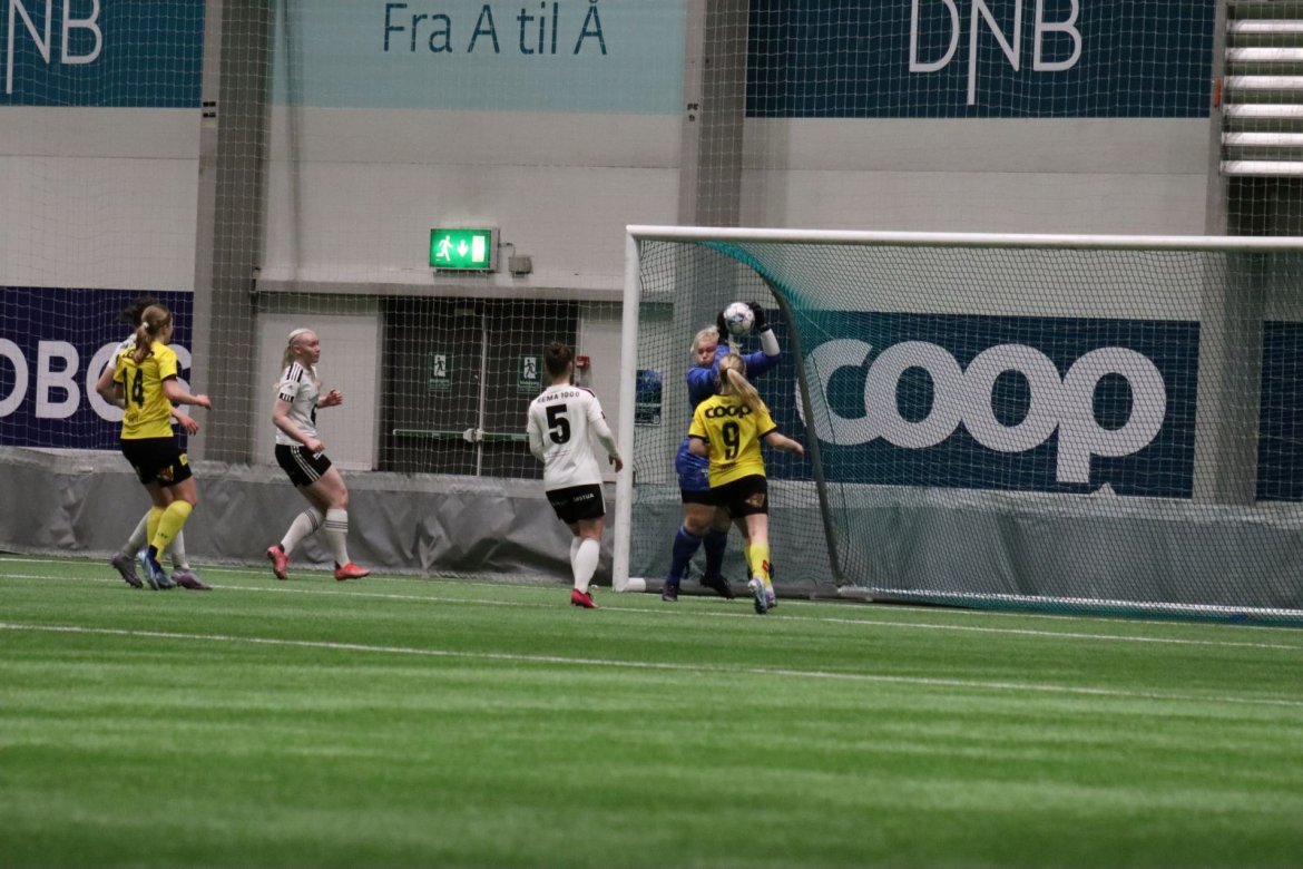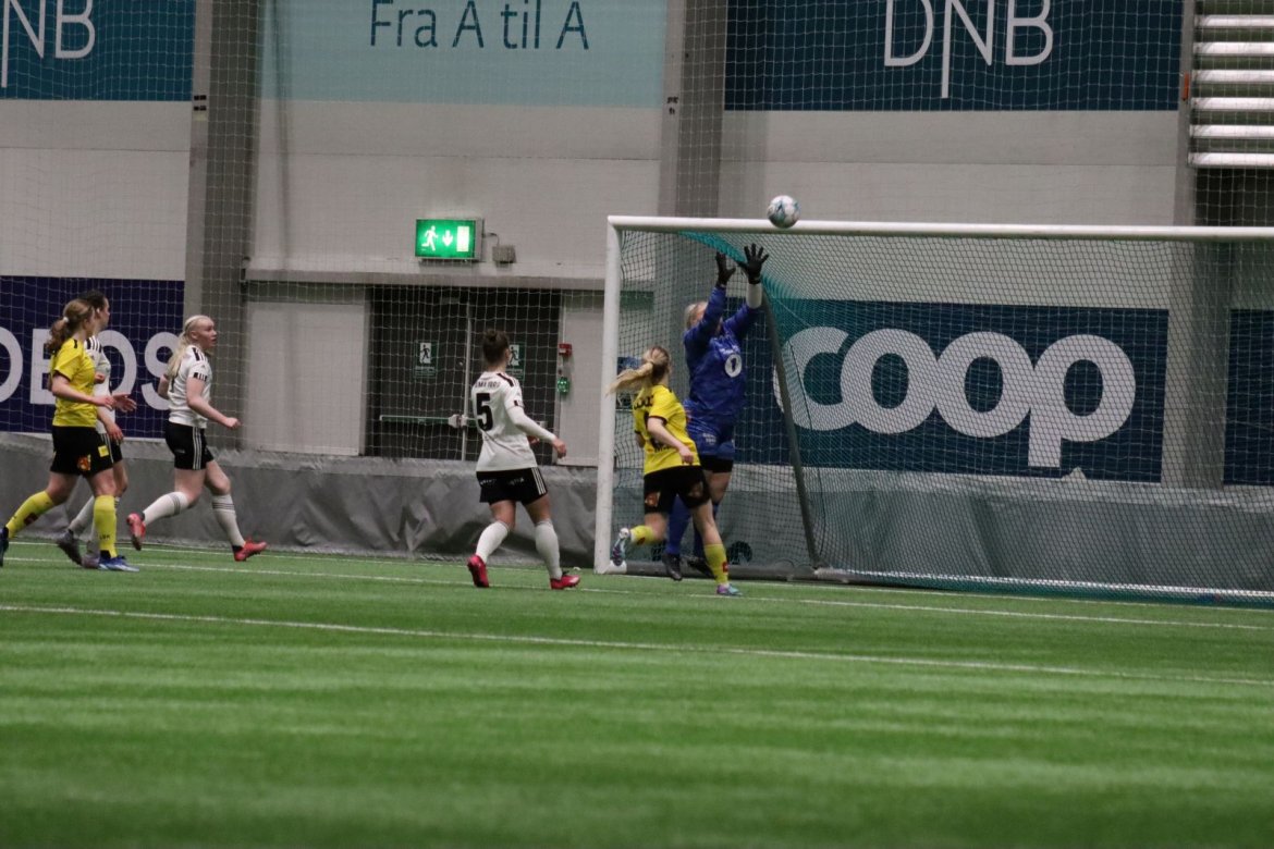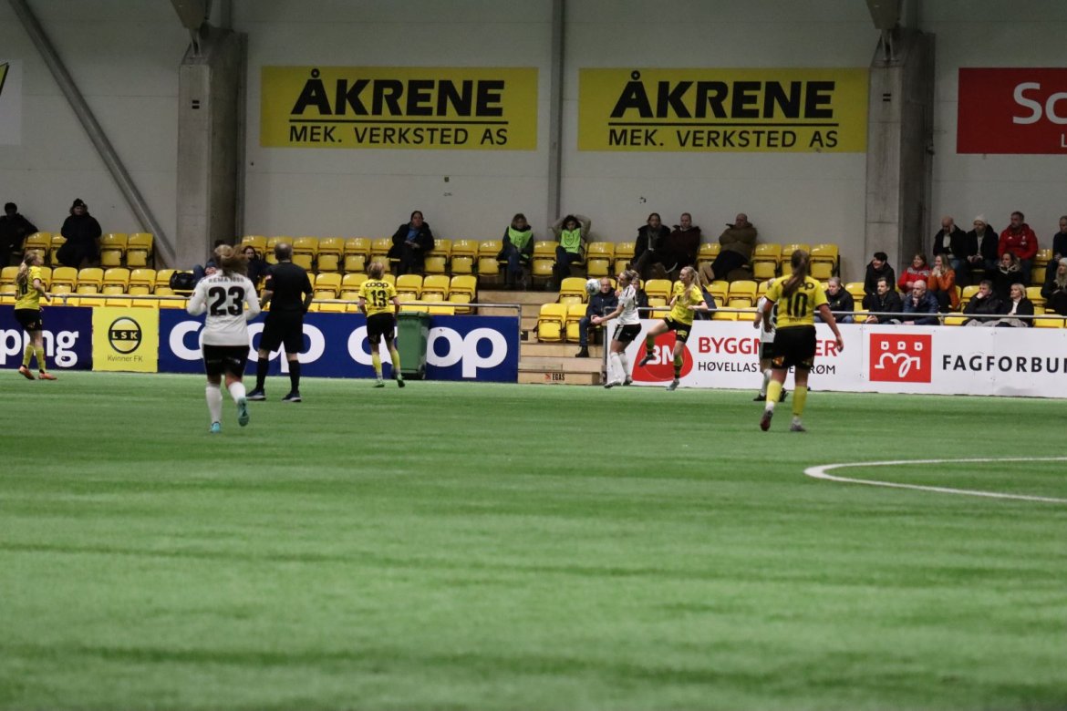 Med kampstart kl. 19.30 er det duket for å brette opp ermene, gjøre et solid stykke arbeid og virkelig blø for drakta. Kampen starter nok en gang med et godt forsvar, og allerede etter 9 minutter lykkes vi i den defensive jobben der vi sideforskyver godt og flytter beina kjapt. Linnea Rustad ser sitt snitt til å snappe ballen fra Lillestrøms forsvarsspiller som fører framover, før hun setter fart nedover høyrekanten. Med høyt tempo gjør hun ingen feil og setter ballen hardt og trygt i mål! Vi åpner med en pangstart, noe som skaper selvtillit og energi i laget. Lillestrøm virker noe rystet, og kampen bølger frem og tilbake hvor begge lag angriper og har målfarlige sjanser. Vi går til pause med 0-1 og føler oss noe tryggere enn sist kamp.
